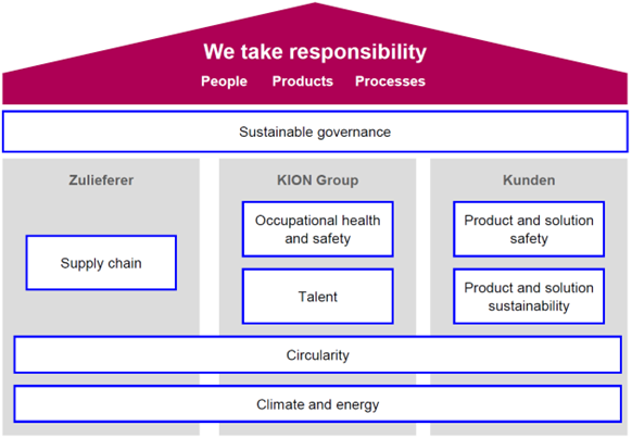 The main IROs in the ESRS topics “Climate change,” “Pollution,” “Water and marine resources,” “Circular economy,” “Own workforce,” “Workers in the value chain,” and “Business conduct” are mainly governed by the strategic objectives within the KION Group’s sustainability strategy or are addressed at another level within the programs of the eight action fields for sustainability. Key findings and newly identified, additional specific topics are taken into account in the ongoing development of the sustainability strategy and when setting targets.